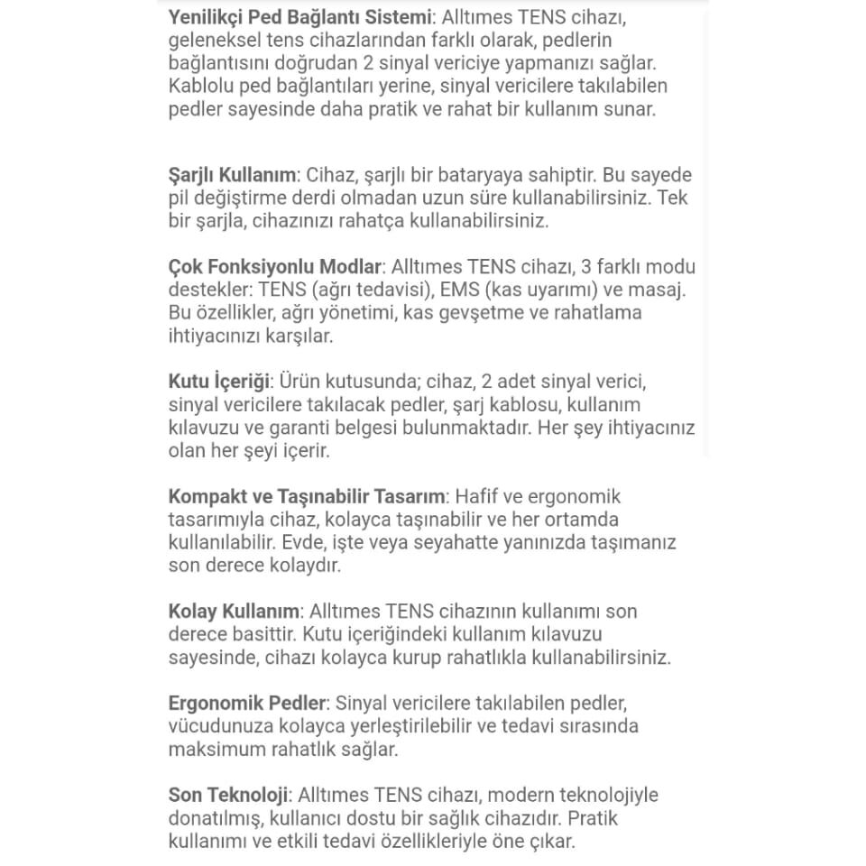 UZAKTAN KUMANDA İLE KONTROL EDİLEN ÇİFT ÇIKIŞLI BİR ELEKTRİKSEL STİMÜLASYON TERAPİ CİHAZIDIR. CİHAZI KULLANMADAN ÖNCE KULLANIM KLAVUZUNDA VERİLEN TÜM TALİMATLARI BAŞTAN SONA OKUMAK VE İLERİDE KULLANMAK ÜZERE GÜVENLİ BİR ŞEKİLDE SAKLAMAK ÖNEMLİDİR .KULLANIM AMACI ,CİHAZ KRONİK AĞRILARININ GİDERİLMESİ DAHİL OLMAK ÜZERE AĞRININ GEÇİÇİ OLARAK GİDERİLMESİ İÇİN KULLANILMAK ÜZERE TASARLANMIŞTIR .CİHAZ ,KAS ATROFİSİNİN ÖNLENMESİ , KASLARIN GÜÇLENDİRİLMESİ VE İYİLEŞTİRİLMESİ , YEREL KAN DOLAŞIMININ ARTTILMASI VE KAS PERFORMANSININ KOLAYLAŞTIRILMASI İÇİN KASLARI UYARMAK ÜZERE TASARLANMIŞTIR .ENDİKASYONLAR