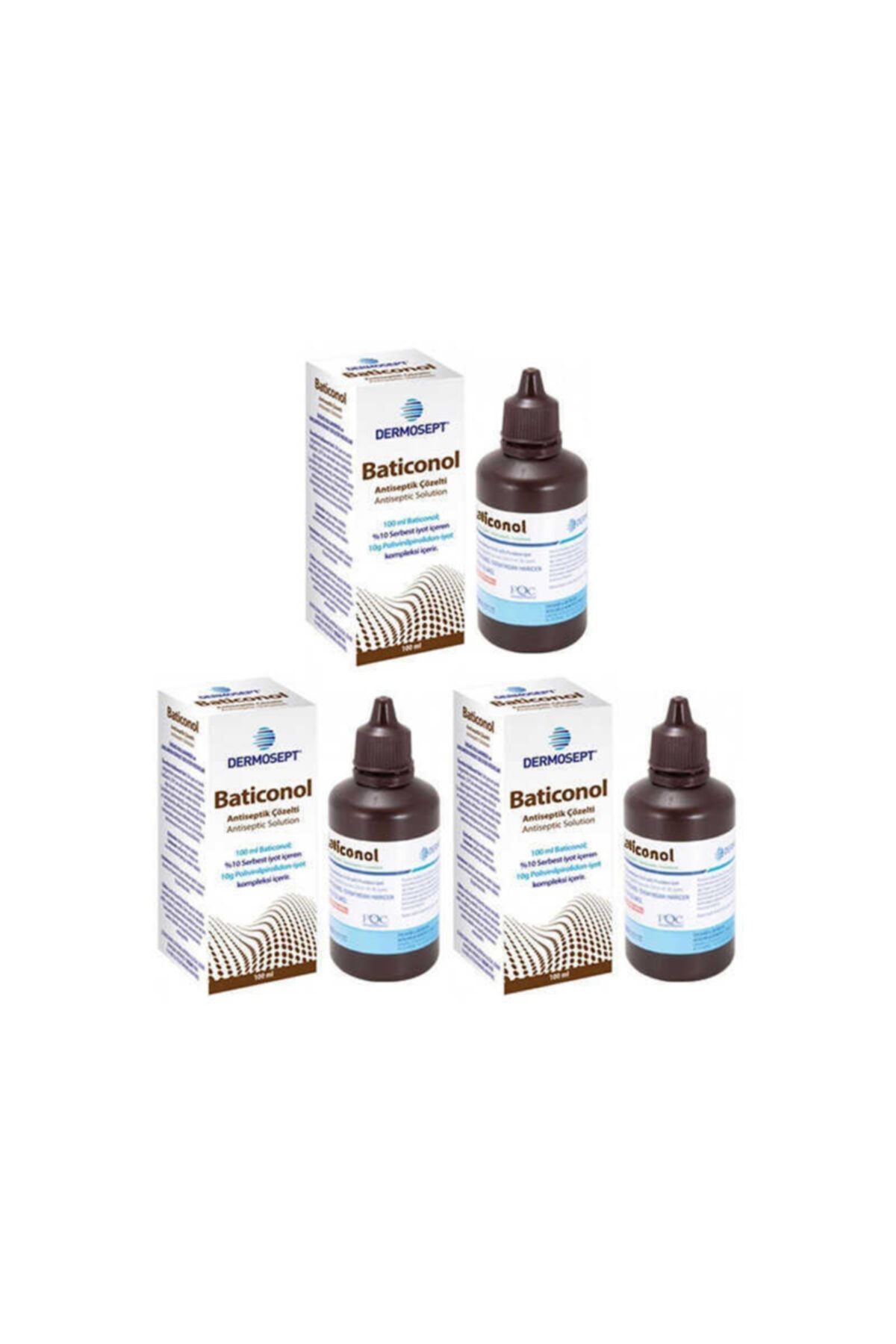 Dermosept - Baticonol Antiseptik Çözelti 100 Ml. Batikon 10'Li Set - Antiseptik, yara tedavilerinde ve yanık tedavilerinde de kullanıma uygundur. - Pyodermi, mikotik ve bakterilere ait olan enfeksiyonlar ile super enfekte dermatozlar için uygundur. - Hijyen gerektiren durumlarda ve el dezenfektanı olarak da kullanılabilir. - İlk yardım gerektiren küçük ve basit çaplı yaralanmalarda da kullanım uygun bir içeriğe sahiptir. - Dermosept antiseptik% 10 povidon, iyodin ve poli iyot kompleksi içeriğine sahiptir. -