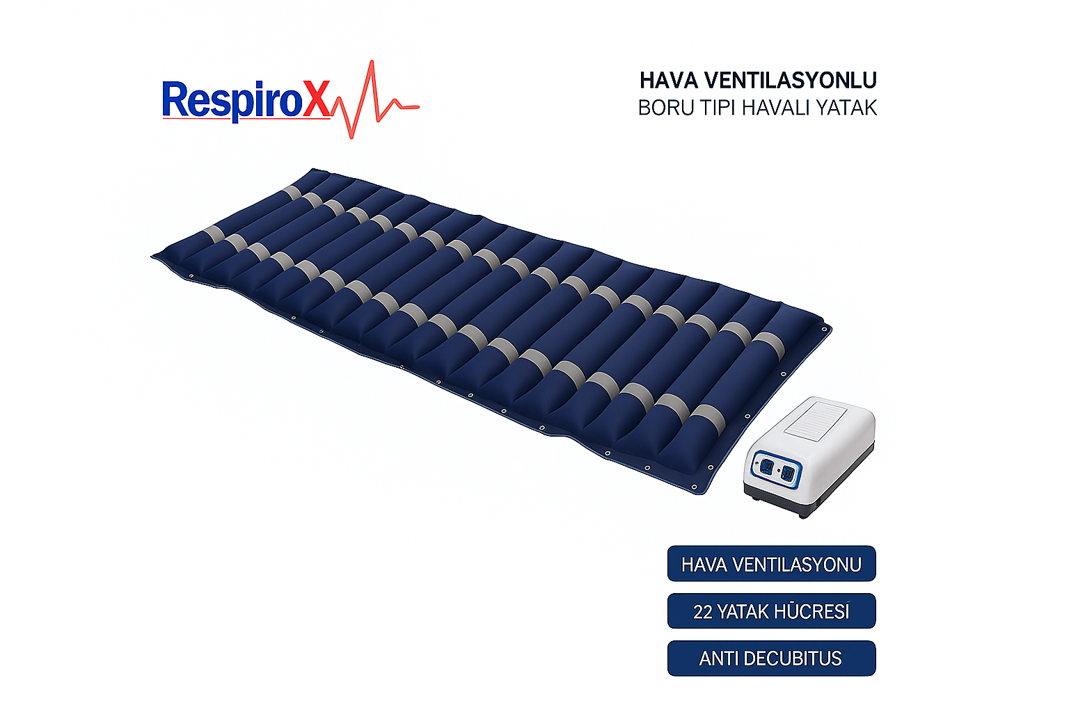 Respirox Hava Ventilasyonlu Boru Tipi Havalı Yatak RHB-01, uzun süre yatakta kalan hastalarda oluşabilecek bası yaralarını (dekübit) önlemeye yardımcı olmak için tasarlanmış profesyonel bir medikal üründür. Boru tipi hava kanalları sayesinde vücut basıncını dengeli şekilde dağıtarak belirli noktalarda oluşan yoğun baskıyı azaltır.