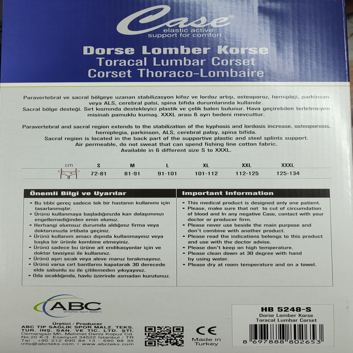 Sacral bölge desteği. Sırt kısmında destekleyici plastik ve çelik balen bulunur. Kol altı süngeri bulunur. Hava geçirgen, gözenekli misinali elastik kumaştan üretilmiştir. S-XXXL arası 6 ayrı bedeni mevcuttur.