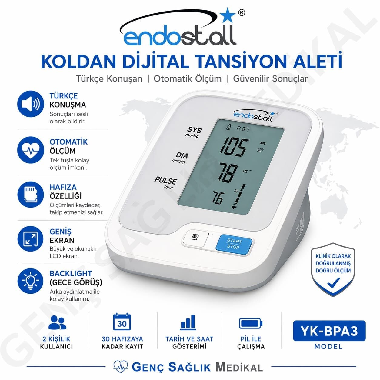 Endostall YK-BPA3, üst koldan ölçüm yapan tam otomatik dijital tansiyon aletidir. Türkçe konuşma özelliği sayesinde ölçüm sonuçlarını sesli olarak bildirir ve kullanım kolaylığı sağlar.