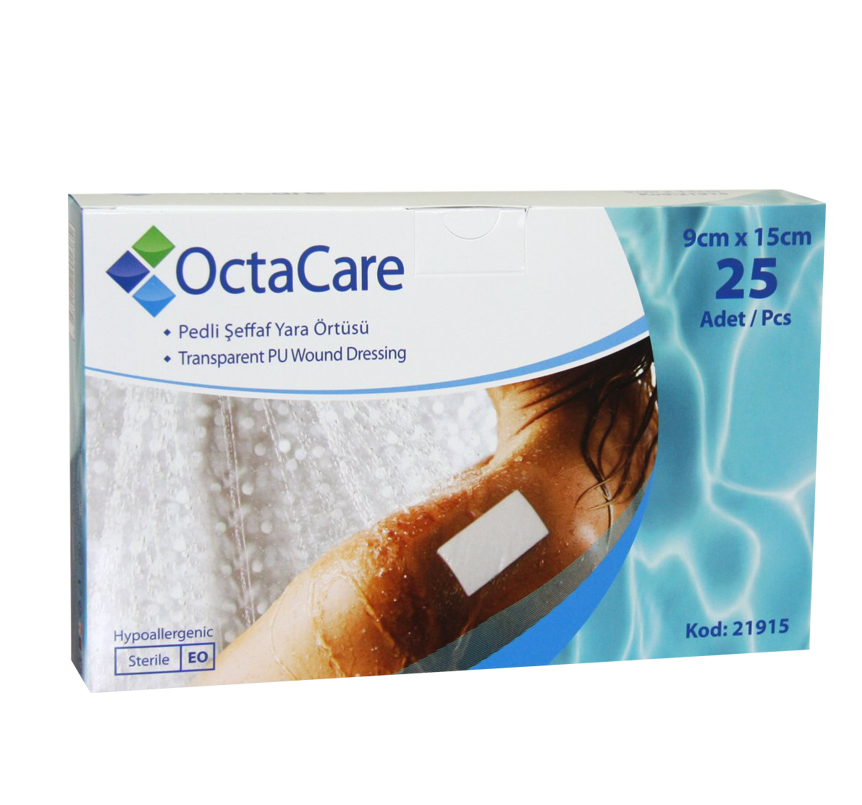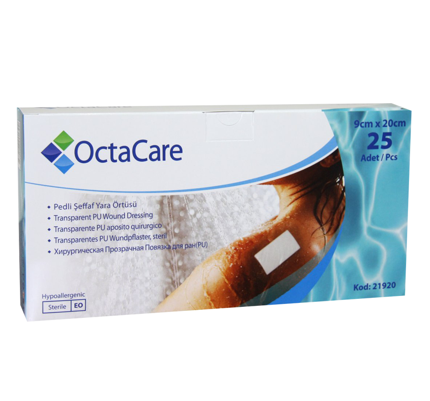 OctaCare Şeffaf Yara Örtüsü, şeffaf Poliüretan malzemeden üretilmiştir. Şeffaf yapısı sayede uygulanan bölgenin sürekli gözlemlenebilir olmasını sağlar. Esnek yapısı sayesinde vücut kıvrımlarına uyum sağlar. Ameliyat sonrasında dikişli bölgelerin korunmasında ve hastanın kendi kendine yapabileceği pansuman değişimlerinde kullanılabilir. Yaranın su ile temasını önlediğinden tedavi süresince duş alabilme rahatlığı sağlar.