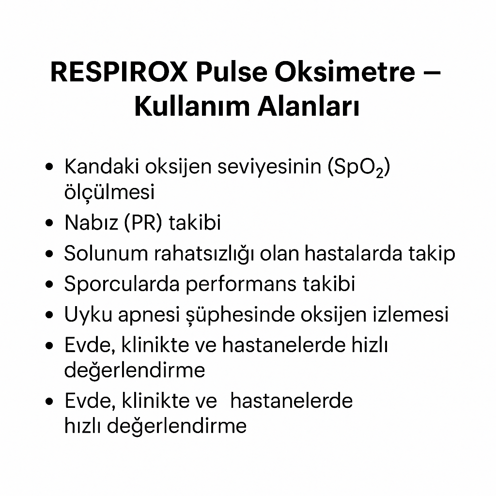 kandaki oksijen satürasyonu (SpO2) ve nabız değerini hızlı ve pratik şekilde ölçmek için kullanılan taşınabilir bir medikal cihazdır. Evde, klinikte veya acil durumlarda kolay kullanım sağlar.