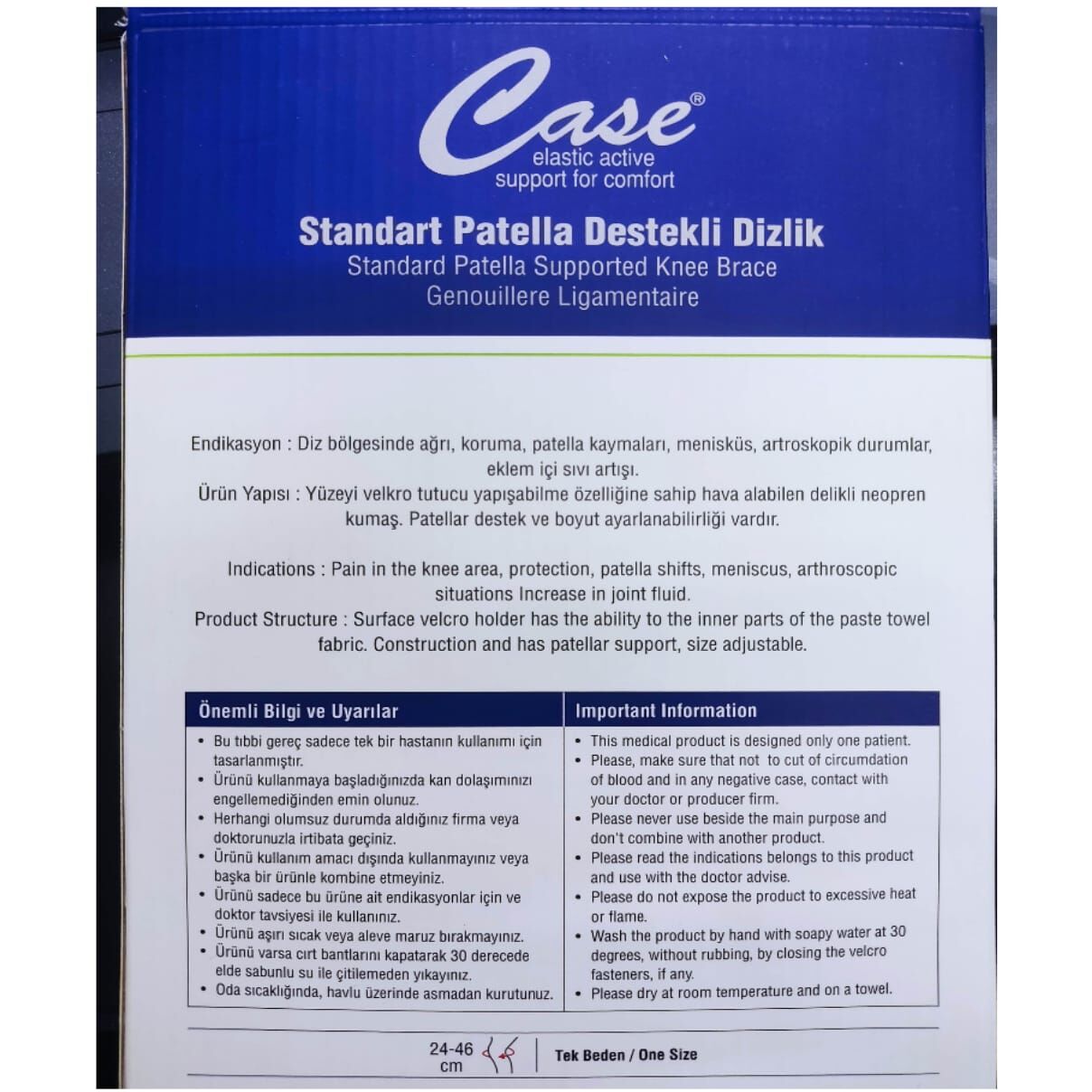 Yüzeyi velkro tutucu yapışabilme özelliğine sahip hava alabilen delikli neopren kumaş. Patellar destek ve boyut ayarlanabilirliği vardır.