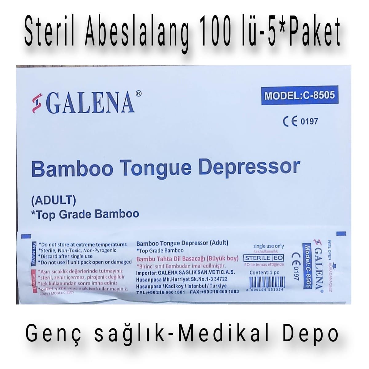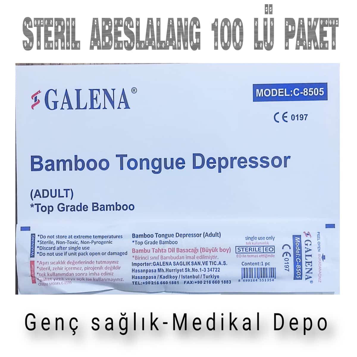Steril Abeslang , Dil basacağı 100'lü-Paket (Galena) , ağız ve boğaz muayenelerinde kullanılan tek kullanımlık steril ahşap dil basacağıdır. Pürüzsüz yüzeyli doğal ahşap malzemeden üretilmiş olup ağız içinde güvenli kullanım sağlar. Yuvarlatılmış uç yapısı sayesinde hastada rahatsızlık oluşturmaz. Steril paketlenmiş olması hijyenik kullanım imkânı sunar.Steril Abeslang , Dil basacağı 100'lü-Paket (Galena)